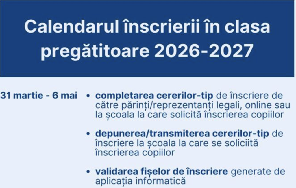 Calendarul înscrierii pentru clasa pregătitoare 2026OMEC 3334Oferta scolarizareStrazi arondateSinteza principalelor elemente cuprinse în calendarul și metodologia